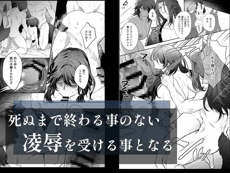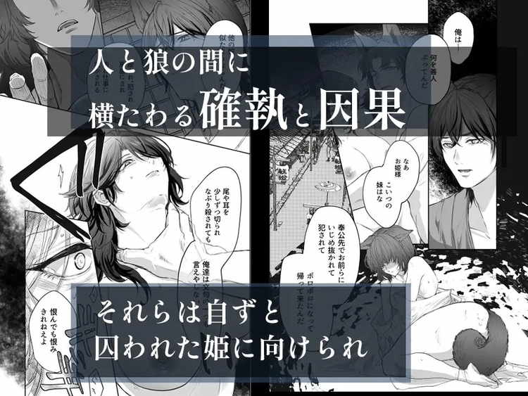 ある夜、人間の姫が連れ去られた。犯人は人間に恨みを持つ人狼一族。目的は巫の血を継いだ白い狼を産ませること。復讐心で燃え上がる人狼たちが姫の肉体を蹂躙し、無理矢理中出しで孕ませに来る複数プレイTL。ケモミミと尻尾を生やしたイケメンたちの精液で中も外もドロドロです。